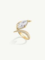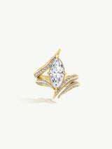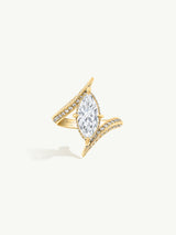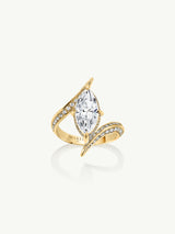 The Ayla Arabesque Engagement Ring by Angie Marei is a timeless piece that is sure to enchant with its captivating ultra-feminine design that exudes sophistication. This unique piece features a brilliant-cut marquise white diamond center stone embellished with pave-set glittering white diamonds and crafted from 18-karat yellow gold. A perfect symbol of your eternal love.