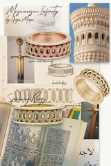 Inspired by Tibetan meditation spinning prayer wheels and the designs of ancient Arabesque and Islamic decorative arts, Marei designed this timeless collection with a unique architectural structure that makes an impression of unending repetition that symbolizes infinite life. In Islamic art, the figure of the circle represents unity and the ultimate source of all diversity in creation. This use of sacred geometry is believed to reflect the language of the Universal Higher Power by reminding us to reflect on the greatness of our divine creation.