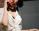 The Roman Choker Necklace by Angie Marei is a modern talisman of strength and sensuality. A sleek bar of 24-karat yellow gold vermeil plated sterling silver rests elegantly against the collarbone, creating a striking contrast of shadow and shine. The soft velvet ribbon ties at the back of the neck, adding a romantic, provocative touch.