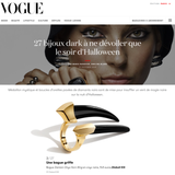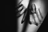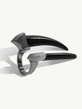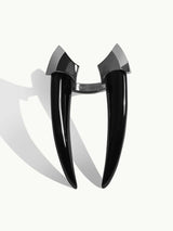 The Damian Black Onyx Talisman Horn Ring by Angie Marei features two hand-carved and polished black onyx horns mounted in a luxurious blackened sterling silver setting. With its salient features, the smooth onyx stones and sculptural shiny blackened silver create an evocative and unique silhouette taking inspiration from apotropaic talismans worn by the royal Ancient Egyptians. This monumental jewel is meant to be worn and proudly displayed with an air of confidence that will surely captivate and subdue your audience.