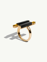 The Invidia Black Onyx Column Ring by Angie Marei is meticulously handcrafted in precious 18-karat yellow gold. This bold yet elegant design features sleek columns of hand-carved and polished black onyx accented by vibrant citrine baguette gemstones, creating a striking contrast of light and shadow. Architecturally bodied and sculptural in form, the ring draws inspiration from the Art Deco period’s anti-traditional elegance and the sacred geometry of Ancient Egyptian art.