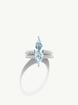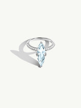 The Marei Diamond Halo Engagement Ring by jewelry designer Angie Marei, showcases a stunning brilliant-cut Marquise Blue Aquamarine jewel enthroned in an Art-Deco-inspired claw setting. Handcrafted from platinum and pavé-set brilliant-cut round white diamonds, this gorgeous piece will dazzle and delight the senses with its hidden halo of sparkling white diamonds creating a sparkling effect around the centerpiece gemstone.