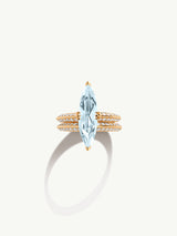 The Marei Diamond Halo Engagement Ring by jewelry designer Angie Marei, showcases a stunning brilliant-cut Marquise Blue Aquamarine jewel enthroned in an Art-Deco-inspired claw setting. Handcrafted from 18-karat yellow gold and pavé-set brilliant-cut round white diamonds, this gorgeous piece will dazzle and delight the senses with its hidden halo of sparkling white diamonds creating a sparkling effect around the centerpiece gemstone.