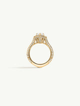 Derived from Hebrew origins, "Atara" embodies meanings of "crown" and "blessed." Drawing inspiration from the regal crowns of antiquity, Marei ingeniously crafted this piece with a geometric, three-dimensional halo of sparkling pavé diamonds. This intricate design elegantly encircles and highlights the exquisite pear-cut diamond center stone. Reflecting regal opulence, Atara's design emphasizes height and splendor, ensuring a truly unforgettable presence.