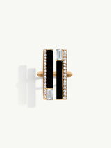 The Invidia Black Onyx Column and White Diamond Ring by Angie Marei is masterfully handcrafted in opulent 18-karat yellow gold. This sculptural piece features striking columns of hand-carved and polished black onyx, flanked by step-cut baguette white diamonds and pavé-set brilliant-cut round white diamonds. Sleek, structured, and architecturally bold, this design draws inspiration from the refined elegance of the Art Deco era and the rich visual language of Ancient Egyptian art.