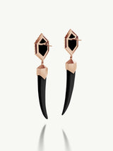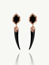 The Alexandria Horn Talisman Drop Earrings by New York jewelry designer Angie Marei feature a striking and sensual etched design inspired by the art deco period and talismans worn by ancient Egyptian royalty. The sleek Onyx Agate stones are beautifully carved and honed by the hands of skilled artisans. Exquisitely handcrafted in 18-karat rose gold. Horn-shaped talismans, also known as the cornicello, Italian for the Devil's Horn, have been worn to protect against the evil eye since ancient history. It is believed that no danger could ever touch the wearer if it were worn as an amulet.