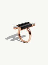 The Invidia Black Onyx Column Ring is a bold yet elegant statement piece, meticulously handcrafted in luminous 18-karat rose gold. At its center, a sleek column of polished black onyx is framed by perfectly aligned straight baguette-cut white diamonds, creating a striking architectural silhouette. The linear precision of the diamonds evokes the geometric sophistication of the Art Deco era, while the opulent gold and onyx combination channels the divine grandeur of Ancient Egyptian royalty.