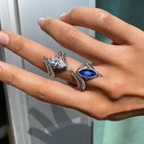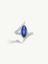 The Ayla Arabesque Engagement Ring by Angie Marei is a timeless piece that is sure to enchant with its captivating ultra-feminine design that exudes sophistication. This unique piece features a brilliant-cut marquise cornflower blue Ceylon sapphire center stone embellished with pave-set glittering white diamonds and crafted from 18-karat white gold. A perfect symbol of your eternal love.