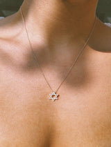 A timeless emblem of faith, identity, and divine protection, the elegant Star of David pendant necklace—crafted in lustrous 14-karat gold and adorned with brilliant pavé-set white diamonds. Each facet of the six-pointed star catches the light, symbolizing harmony between the spiritual and physical realms. Suspended from a delicate chain, this radiant piece is both a sacred talisman and a refined expression of personal style.