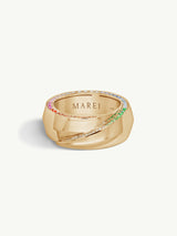 Inspired by the sprawling sand dunes of Africa’s most striking desert landscapes, the Sahara Oasis Ring by jewelry designer Angie Marei is exquisitely handcrafted from luxurious 18-karat yellow gold. A glistening raised peak winds around the piece, its edges beautifully accented with scintillating brilliant white diamonds and a mesmerizing rainbow ombré effect created by multi-colored sapphires and Tsavorite garnets.