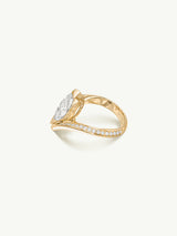 The Yasmeen Ring by Angie Marei is a breathtaking homage to the timeless elegance of the jasmine flower, masterfully fusing cultural richness with exquisite artistry. At its heart glows a stunning marquise-cut white diamond, its elongated shape reminiscent of a jasmine petal. This exceptional gem is elegantly cradled within an 18-karat yellow gold setting, adorned with shimmering white diamond accents, and finished with luminous white enamel. The design artfully mirrors the delicate embrace of flower petals, embodying the jasmine’s symbolism of purity, love, and grace.