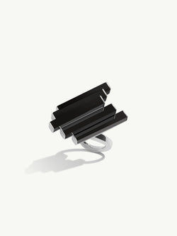 The Invidia Black Onyx Column Ring by New York jewelry designer Angie Marei. Exquisitely hand-crafted in 18-karat white gold and polished black onyx gemstones. This beautiful architectural ring combines the opulence and glamour of the Art Deco era with the marvelous jewels of the Ancient Egyptian royals.