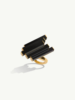 The Invidia Black Onyx Column Ring by New York jewelry designer Angie Marei. Exquisitely hand-crafted in 18-karat yellow gold and polished black onyx gemstones. This beautiful architectural ring combines the opulence and glamour of the Art Deco era with the marvelous jewels of the Ancient Egyptian royals.