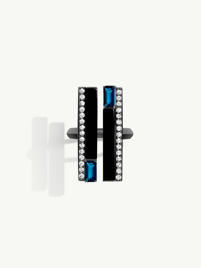 The Invidia Black Onyx and Blue Sapphire Column Ring by Angie Marei is a bold and sculptural statement piece, meticulously handcrafted in luminous 18-karat blackened gold. This captivating design features sleek columns of hand-carved and polished black onyx, accented with vibrant baguette-cut blue sapphires, and framed by brilliant pavé-set and straight baguette-cut white diamonds. Architecturally bodied and exquisitely balanced, the ring embodies the geometric precision and modern glamour of the Art Deco era, fused with the sacred artistry and symbolism of Ancient Egyptian jewelry.
