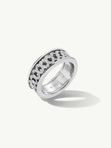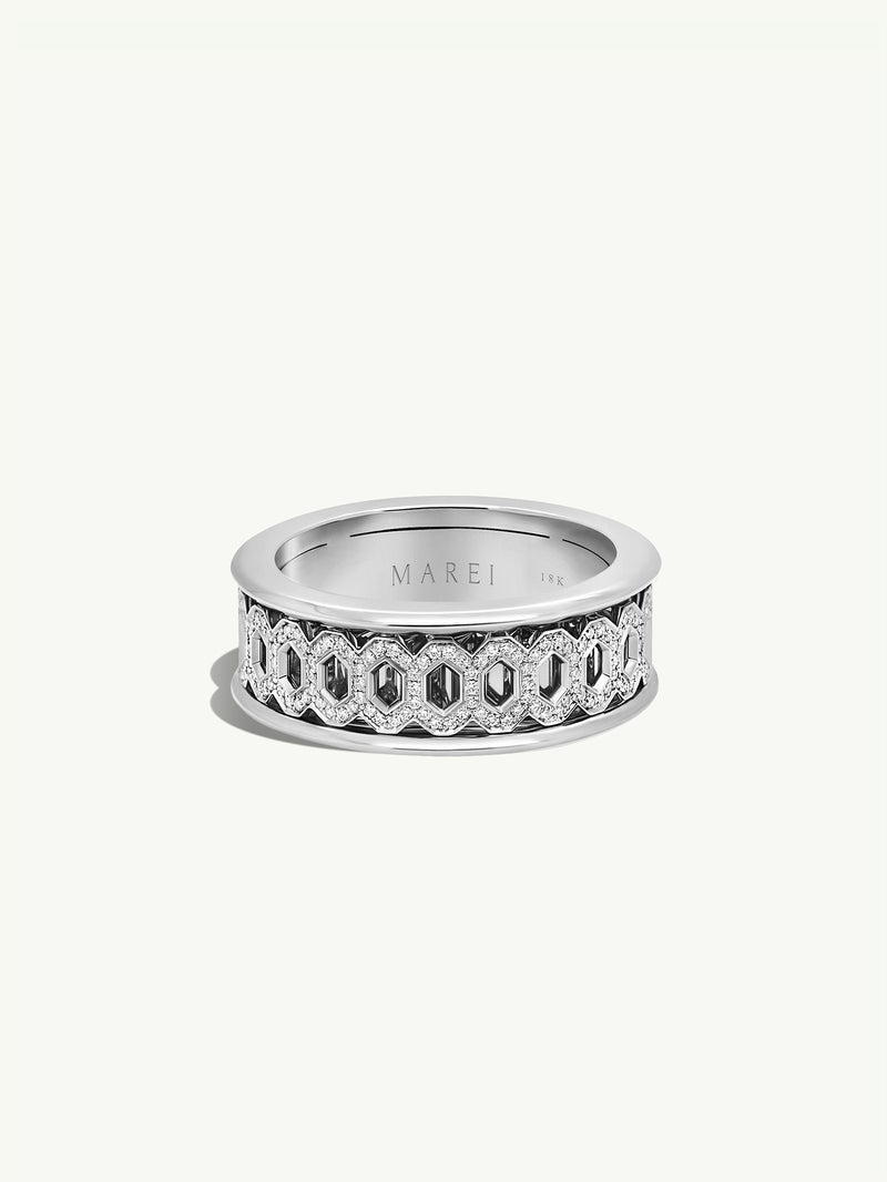 The Amanti Spinning Infinity Ring by New York jewelry designer Angie Marei is exquisitely handcrafted with great precision in luxurious 18-karat white gold precious metal. This elegant design possesses an intricate pattern of brilliant pavé diamond geometric dimensional windows creating a glittering vignette that shines and reflects light from all angles.
