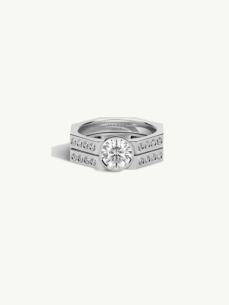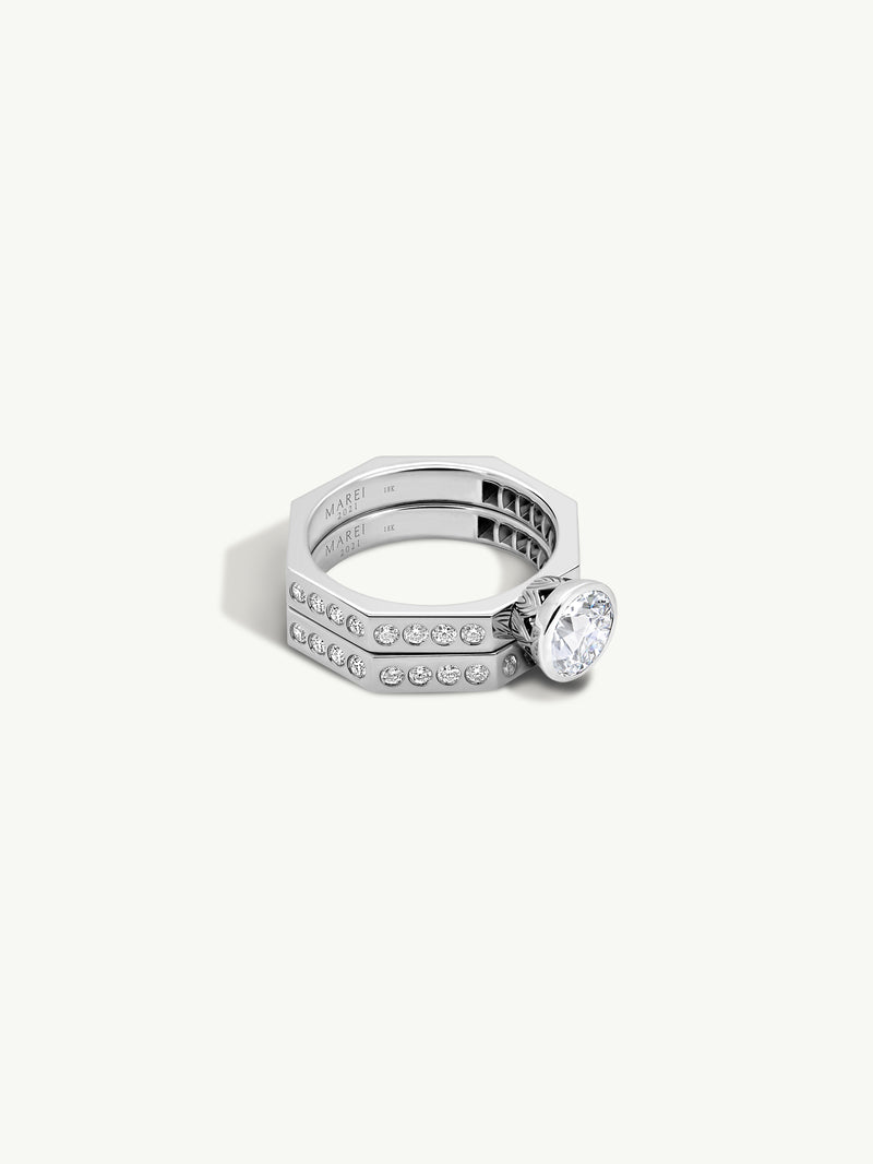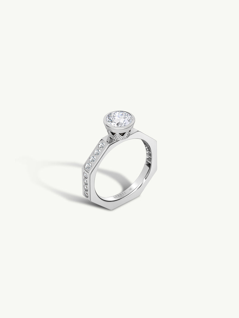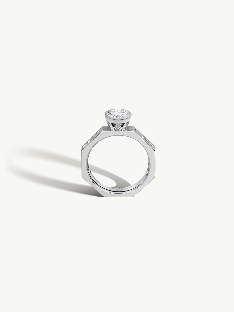 In sacred geometry, the 8-sided octagon shape is seen as two shapes coming together: a circle and a square. The ring symbolizes heaven, and the square represents the earth. The unification of these two energies creates an infinite connection. The octagon shape is often found in ancient buildings of worship as representing infinity and eternal life. Featured on NaturalDiamonds.com.