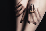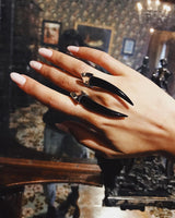 The Damian Black Onyx Horn Talisman Ring by Angie Marei features two hand-carved and polished black onyx horns mounted in a luxurious solid 18-karat yellow gold setting. With its salient features, the smooth onyx stones and gleaming gold create an evocative and unique silhouette taking inspiration from apotropaic talismans worn by the royal Ancient Egyptians. This monumental jewel is meant to be worn and proudly displayed with an air of confidence that will surely captivate and subdue your audience.
