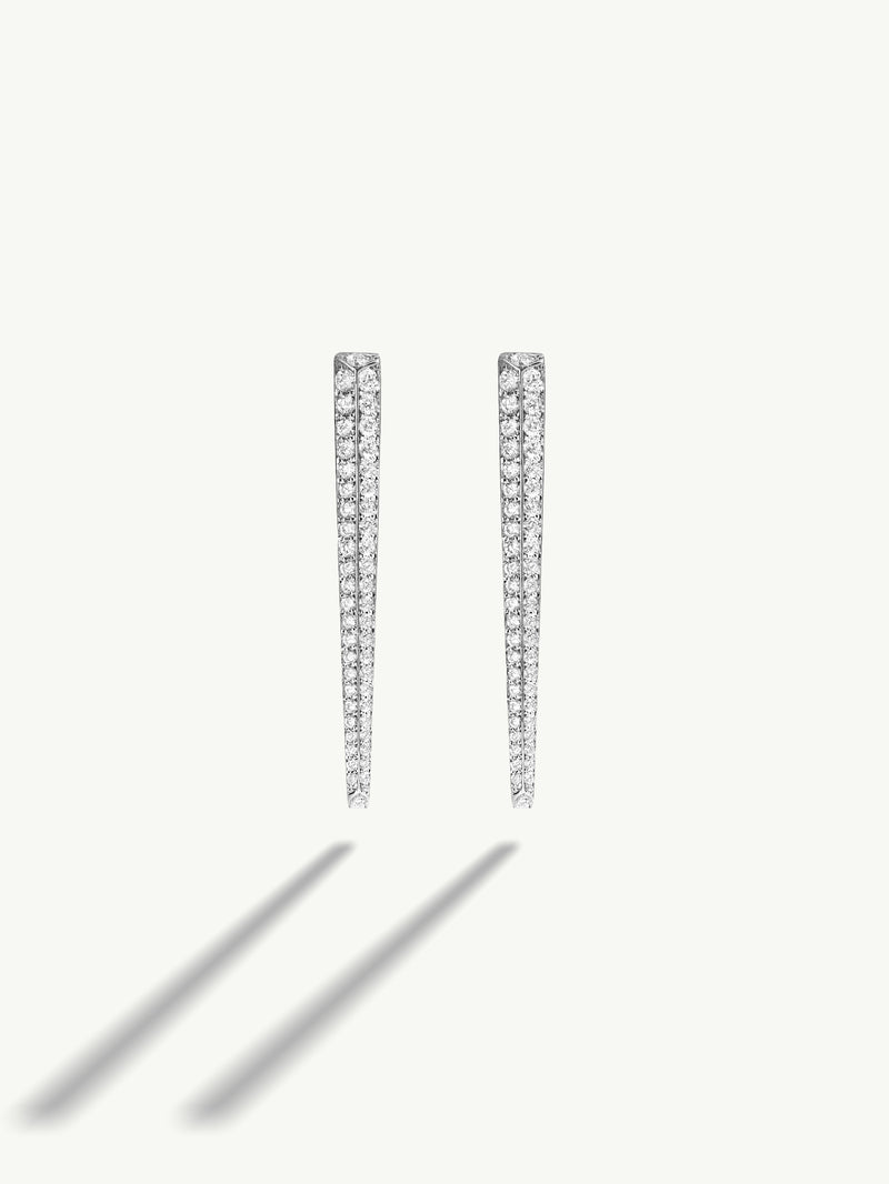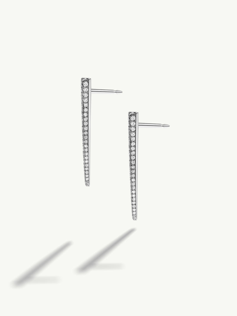 The Lilith Dagger Earrings by designer Angie Marei exude edgy elegance with their sharp, knife-edge design in lustrous platinum, adorned with pavé-set brilliant white diamonds that capture and reflect light from every angle. These striking earrings are crafted for the fearless femme fatale, taking you effortlessly from day into night.