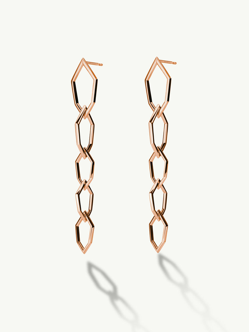 The Amanti Chain Link Earrings feature geometric hexagon pendants - the ancient sacred symbol meaning spiritual consciousness, balance, and male and female energy. Meticulously handcrafted in 18-karat rose gold, the clean beveled edges of the interlocking graduating link pendants reflect light from every angle.