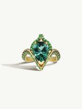 The Oceanna Ring is an imaginative and exotic Art Noveau-inspired jewel designed by Angie Marei that features an alluring and radiant pear-shaped mint green Tourmaline and Green Tsavorite Garnets in an 18-karat yellow gold mounting.