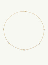 The Eternal by Marei Five Diamond Necklace is a delicate expression of timeless light. Handcrafted in luminous 14-karat gold, five natural diamonds are set in refined stations along an elegant 18-inch chain, offering a subtle, radiant sparkle that feels effortlessly luxurious.