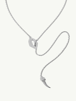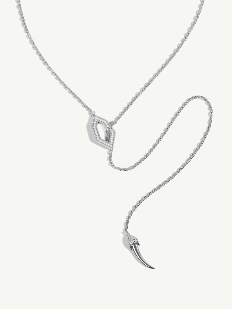 The Amanti Hexagon Pendant Lariat Necklace by Angie Marei features a hexagon and horn talisman pendant handcrafted in luxurious 18-karat white gold and sparkling pavé-set white diamonds. The eye-catching diamond-cut cable style chain gets its name because the edges of the chain are cut at such an angle that light is reflected on the surface of the metal, creating a scintillating sparkle resembling the flash of a diamond. This necklace can be worn as a lariat necklace or wrapped around as a choker necklace.