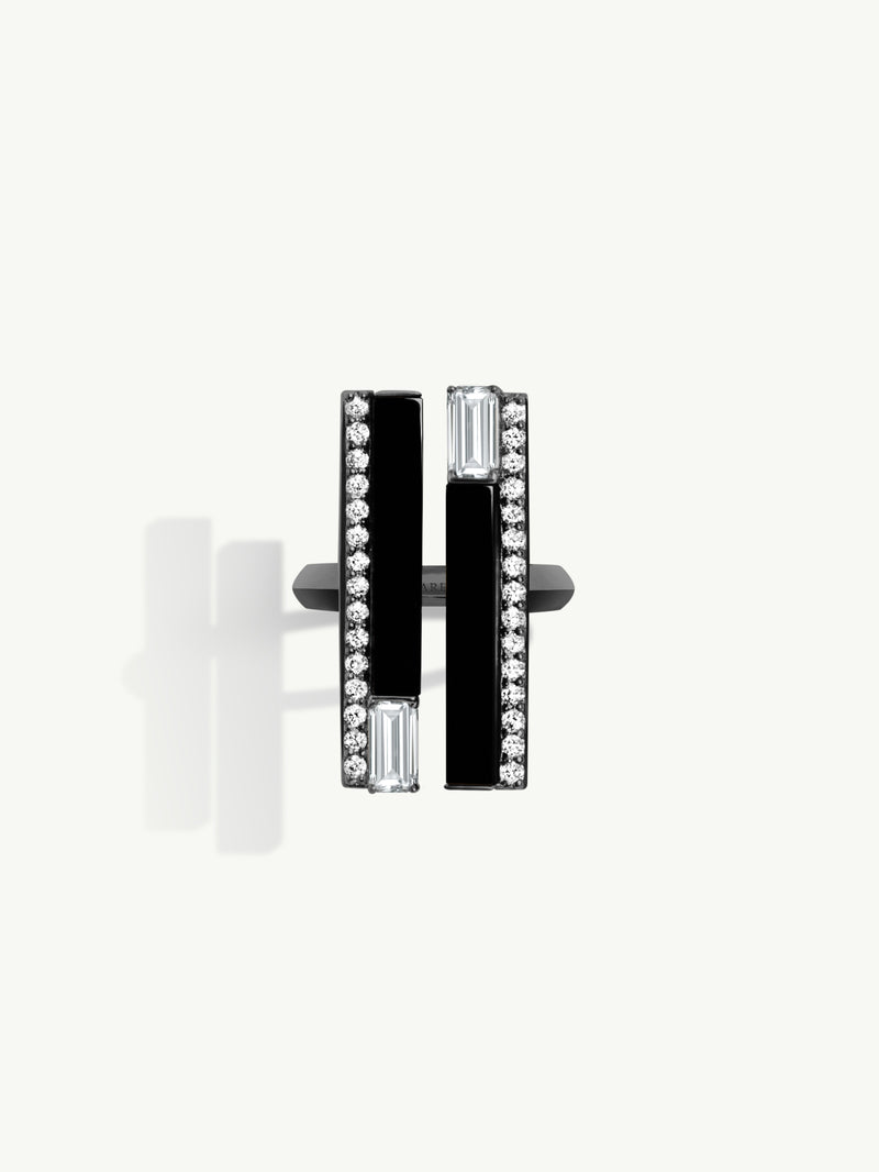 The Invidia Black Onyx Column and White Diamond Ring by Angie Marei is masterfully handcrafted in opulent blackened 18-karat gold. This sculptural piece features striking columns of hand-carved and polished black onyx, flanked by step-cut baguette white diamonds and pavé-set brilliant-cut round white diamonds. Sleek, structured, and architecturally bold, this design draws inspiration from the refined elegance of the Art Deco era and the rich visual language of Ancient Egyptian art.