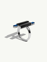 The Invidia Black Onyx Column Ring by New York designer Angie Marei is handcrafted in luxurious 18-karat white gold and features a sleek column of polished black onyx accented by baguette-cut blue sapphires. This striking design evokes the geometric elegance of the Art Deco era and the splendor of the jeweled treasures once worn by Ancient Egyptian royalty.