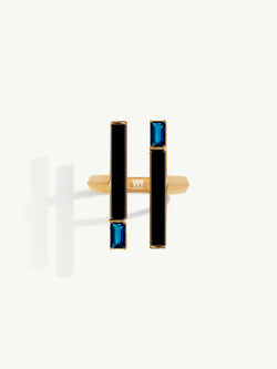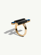The Invidia Black Onyx Column Ring by New York designer Angie Marei is handcrafted in luxurious 18-karat yellow gold and features a sleek column of polished black onyx accented by baguette-cut blue sapphires. This striking design evokes the geometric elegance of the Art Deco era and the splendor of the jeweled treasures once worn by Ancient Egyptian royalty.