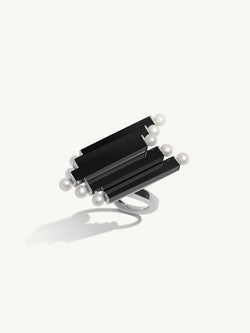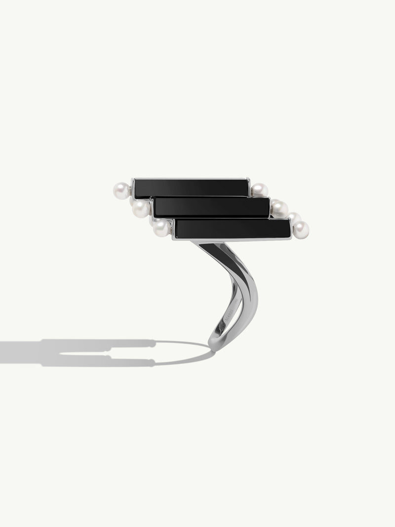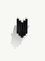 The Invidia Black Onyx Column & Pearl Ring by Angie Marei is exquisitely hand-crafted in 18-karat white gold and features black onyx and white pearls. This beautiful architectural ring combines the opulence and glamour of the Art Deco era with the marvelous jewels of the Ancient Egyptian royals.