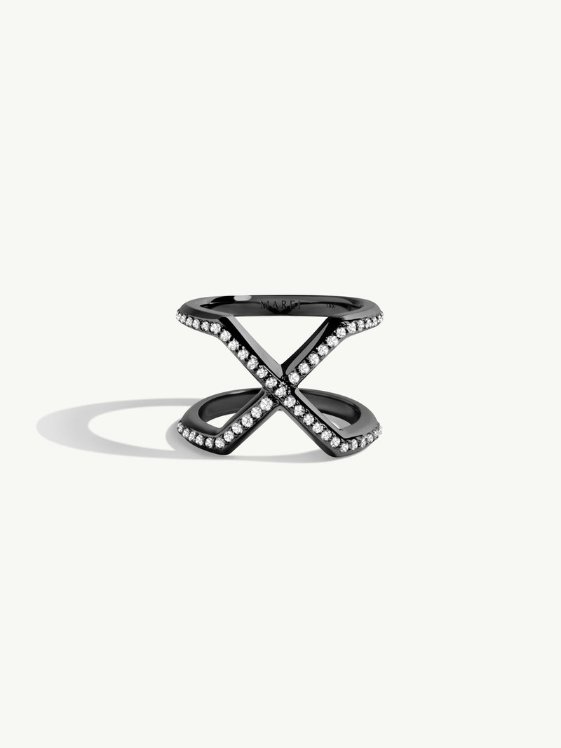 The Exquis Pavé-Set Brilliant White Diamond Infinity Ring by Angie Marei features an architectural cross-over infinity design that symbolizes eternal love and power. Exquisitely handcrafted in luxurious 18-karat blackened gold and pave-set brilliant white diamonds that sparkle and reflect light from every angle.