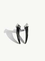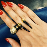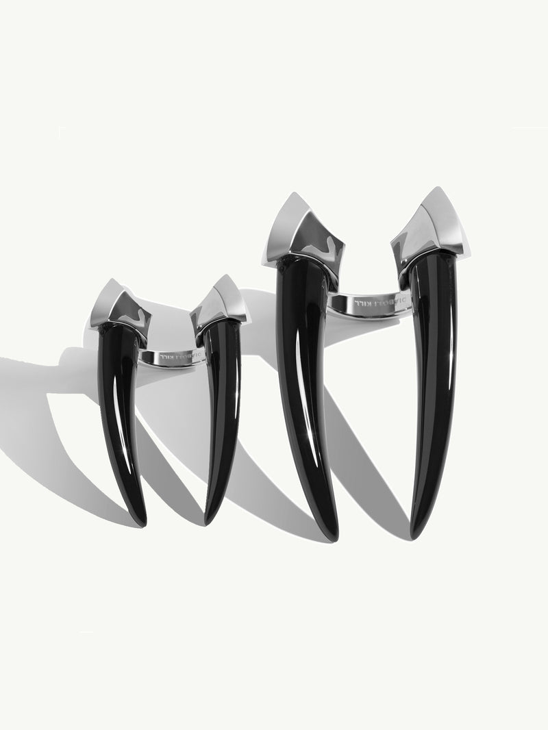 The Mini Damian Black Onyx Horn Talisman Ring by Angie Marei features hand-carved and polished black onyx horns mounted in a luxurious sterling silver setting. With its salient features, the smooth onyx stones and sculptural glimmering gold create an evocative and unique silhouette taking inspiration from apotropaic talismans worn by the royal Ancient Egyptians. This monumental jewel is meant to be worn and proudly displayed with an air of confidence that will surely captivate and subdue your audience.