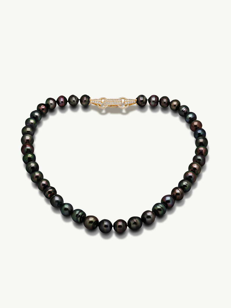 The Nyx Tahitian Black Pearl Necklace by designer Angie Marei is a daring new take on the classic pearl necklace. This unisex piece features multi-colored Tahitian Black Circle Pearls and a custom-designed hardware-inspired clasp crafted from luxurious 18k yellow gold with pavé set brilliant cut white diamonds, designed to be worn front or back, depending upon your preference.