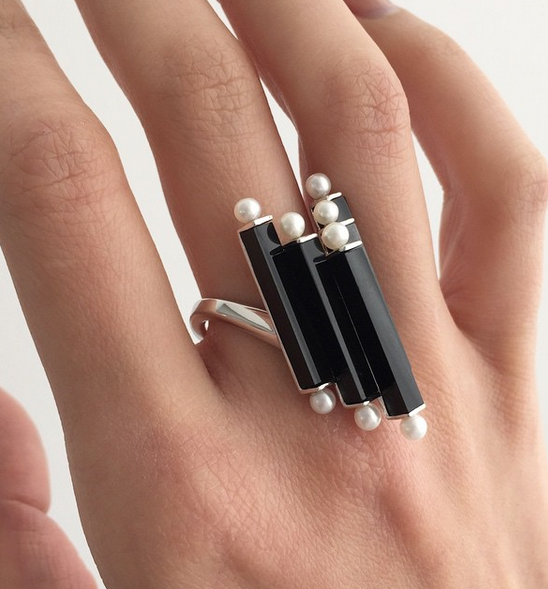 The Invidia Black Onyx Column & Pearl Ring by Angie Marei is exquisitely hand-crafted in 18-karat yellow gold and features black onyx and white pearls. This beautiful architectural ring combines the opulence and glamour of the Art Deco era with the marvelous jewels of the Ancient Egyptian royals.