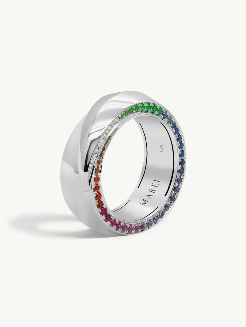 - Pavé-set brilliant-cut round natural white diamonds, an array of multi-colored natural sapphires and Tsavorite garnets on both sides of the ring