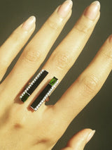 The Invidia Black Onyx Column Ring by Angie Marei is a bold and sculptural statement piece, meticulously handcrafted in precious 18-karat white gold. This luminous design features sleek columns of hand-carved and polished black onyx, accented with warm citrine baguette gemstones, and elegantly framed by brilliant pavé-set and straight baguette-cut white diamonds. Architecturally bodied and exquisitely balanced, the ring embodies the geometric precision and modern glamour of the Art Deco era, fused with the sacred artistry and symbolism of Ancient Egyptian jewelry.