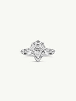 The Atara Engagement Ring, envisioned by Angie Marei, showcases a mesmerizing brilliant-cut pear-shaped white diamond center stone, expertly mounted on a platinum setting embellished with radiant pavé set brilliant-cut white diamonds.