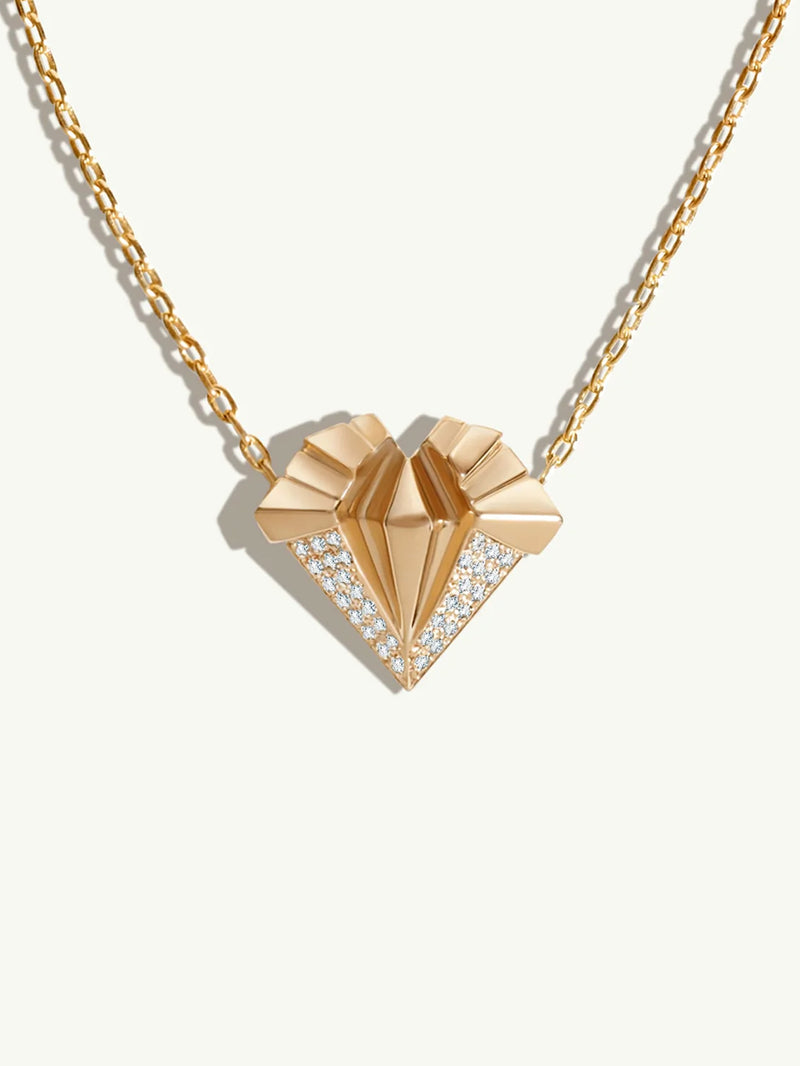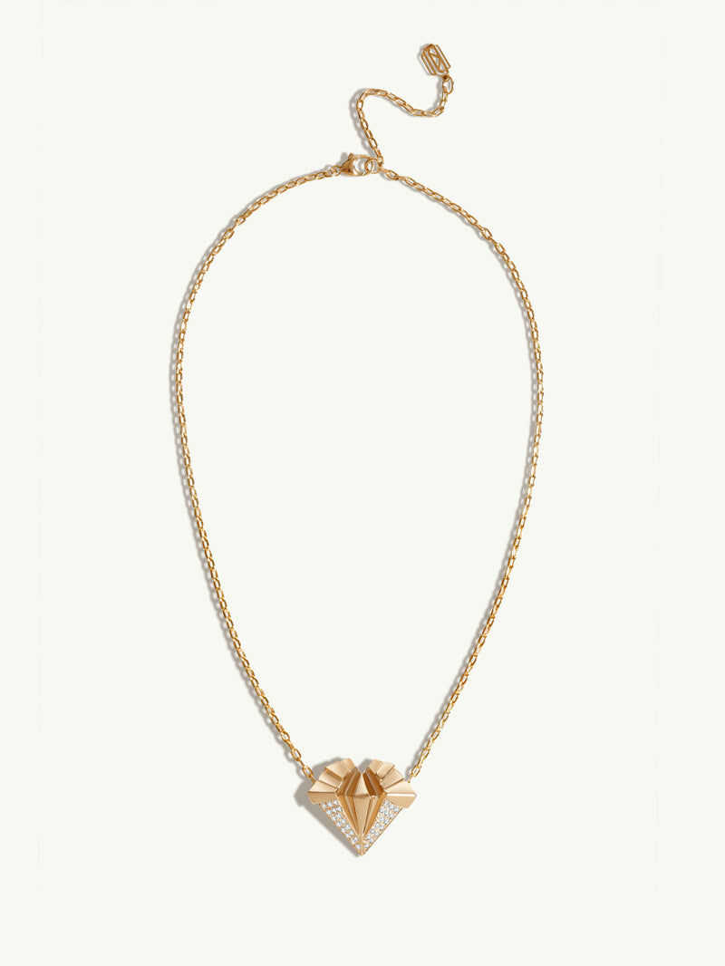 The Alexandria Pendant Necklace by Angie Marei features a gorgeous art deco-inspired pendant with pavé-set brilliant white diamonds on a gleaming cable chain handcrafted in 18-karat yellow gold. In this piece, Marei takes inspiration from the Step Pyramid of Djoser of Ancient Egypt that ascended upwards from the ground towards the sky, symbolizing a stairway to heaven.