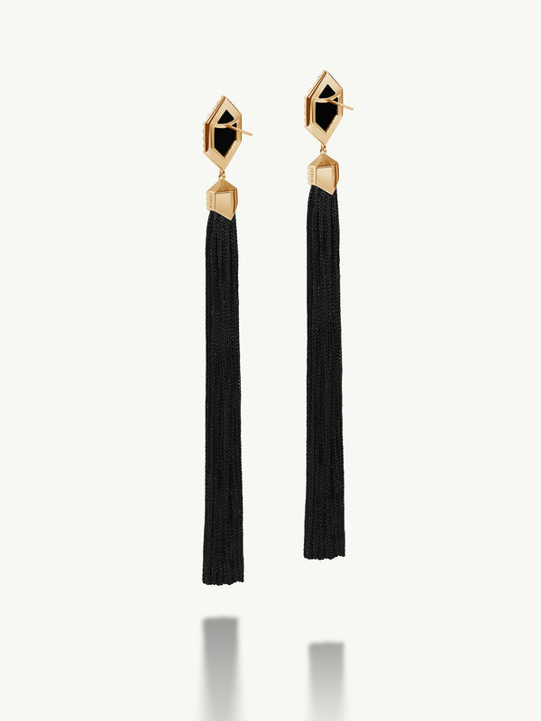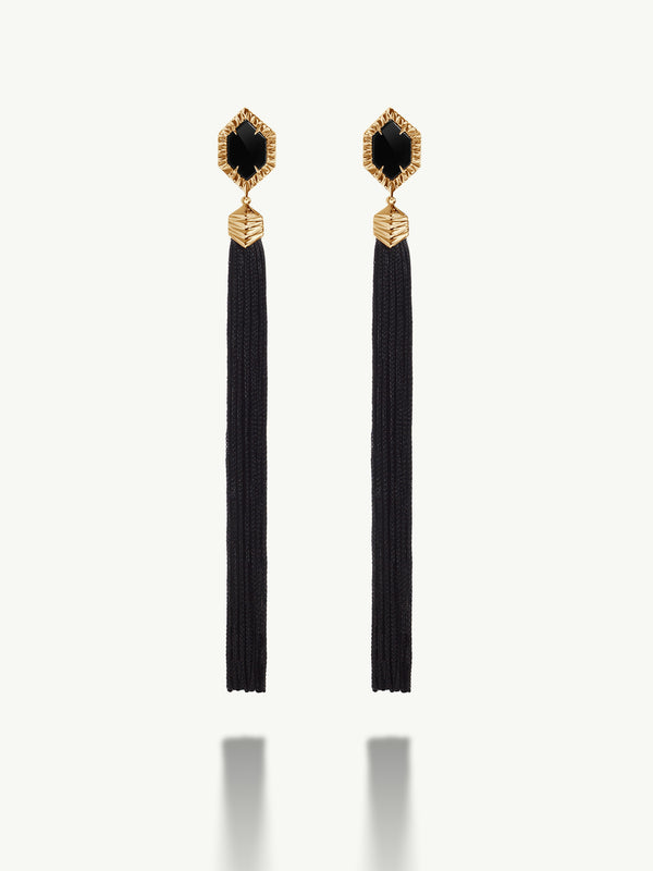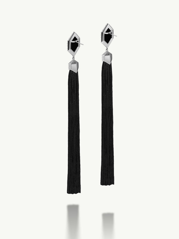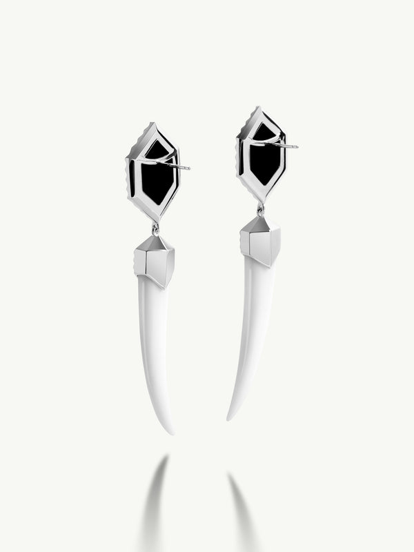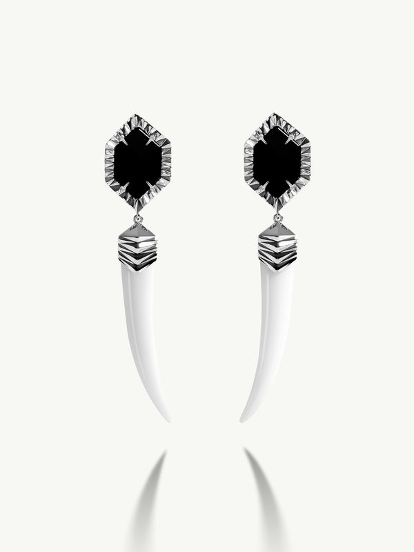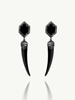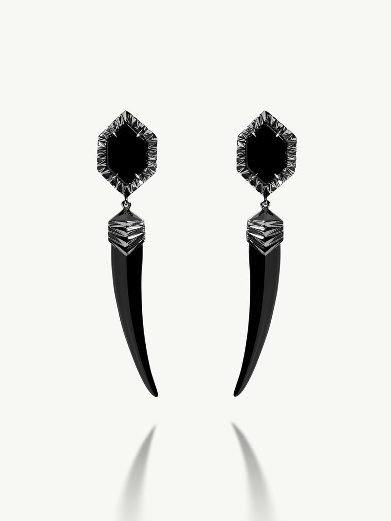 The Alexandria Horn Talisman Drop Earrings by New York jewelry designer Angie Marei feature a striking sensual design inspired by the art deco period and talismans worn by ancient Egyptian royalty. The sleek black Onyx Agate stones are beautifully carved and honed by the hands of skilled artisans. Exquisitely handcrafted in blackened 18-karat white gold. Horn-shaped talismans, also known as the cornicello, Italian for the Devil's Horn, have been worn to protect against the evil eye since ancient history. It is believed that no danger could ever touch the wearer if it were worn as an amulet.