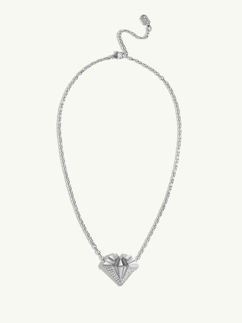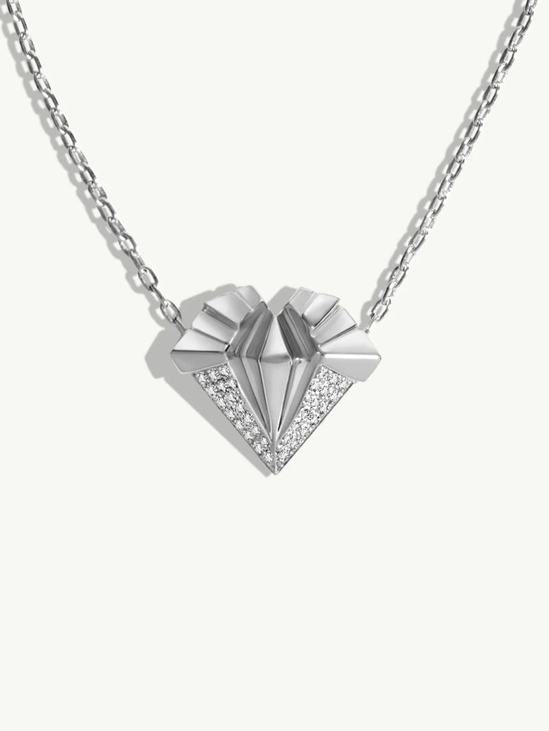 The Alexandria Pendant Necklace by Angie Marei features a gorgeous art deco-inspired pendant with pavé-set brilliant white diamonds and a gleaming cable chain handcrafted in 18-karat white gold. In this piece, Marei takes inspiration from the Step Pyramid of Djoser of Ancient Egypt that ascended upwards from the ground towards the sky, symbolizing a stairway to heaven.
