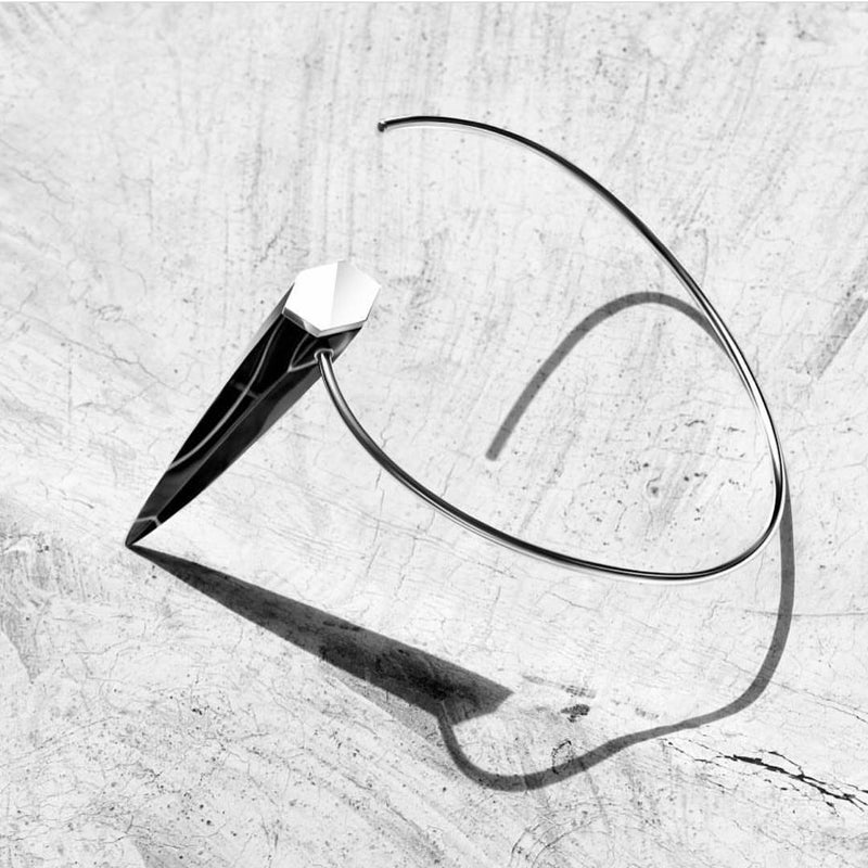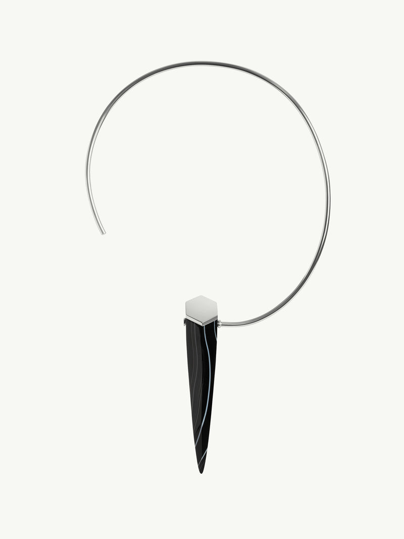 The Black Onyx Pendulum Sculptural Necklace by Angie Marei is daring in its unique, bold design inspired by ancient artifacts. Featuring a salient black onyx pendant, beautifully hand-carved, faceted, and polished from natural raw gemstone by highly skilled artisans. The hand-forged sterling silver neckpiece contours around the collar bone, suspending the black onyx talisman pendant.