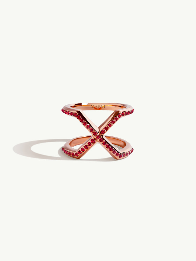 The Exquis Infinity Ring by Angie Marei features an architectural cross-over infinity design that symbolizes eternal love and power. Exquisitely handcrafted in 18-karat rose gold and beautiful pavé-set brilliant cut rubies.
