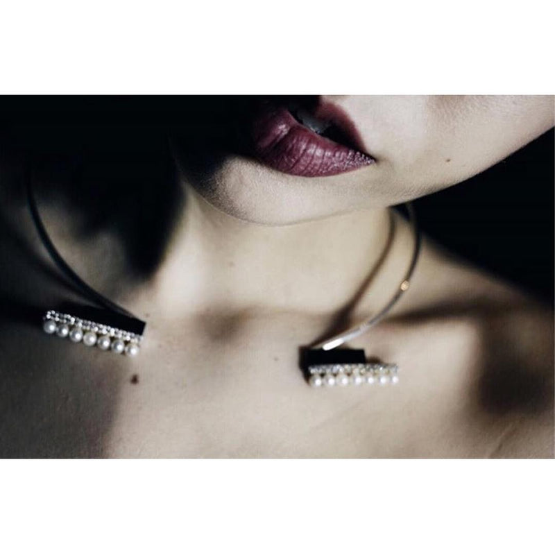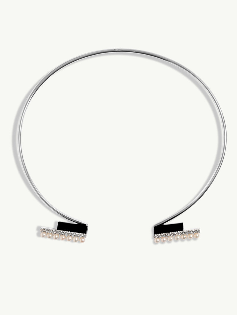 The Invidia Black Onyx Column & Pavé-Set Brilliant-Cut White Diamond Collar Necklace With Freshwater Pearls by New York jewelry designer Angie Marei. Exquisitely hand-crafted in 18-karat white gold, black onyx gemstones, pavé-set brilliant-cut round diamonds, and fresh water white pearls. This elegant piece combines the opulence and glamour of the Art Deco era with the marvelous jeweled necklaces of the Ancient Egyptian royals.