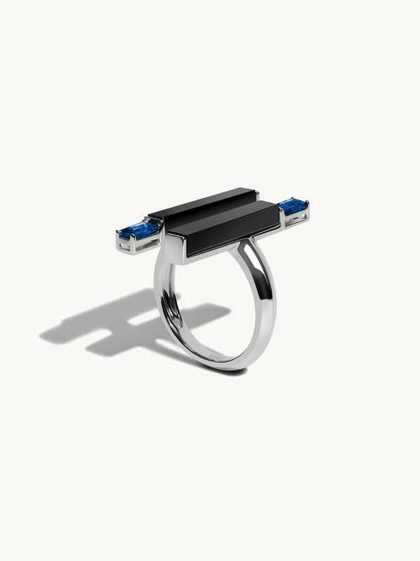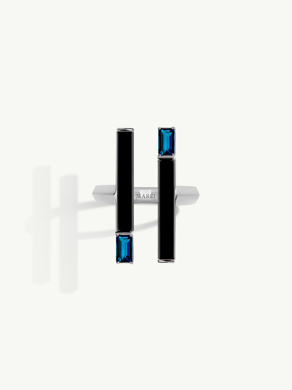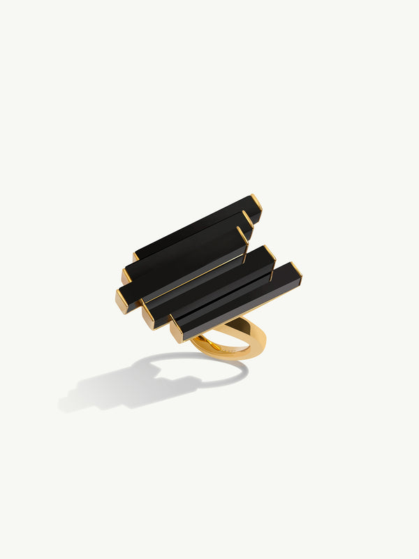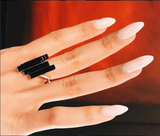 The Invidia Black Onyx Column Ring by New York jewelry designer Angie Marei. Exquisitely hand-crafted in 18-karat white gold and polished black onyx gemstones. This beautiful architectural ring combines the opulence and glamour of the Art Deco era with the marvelous jewels of the Ancient Egyptian royals.