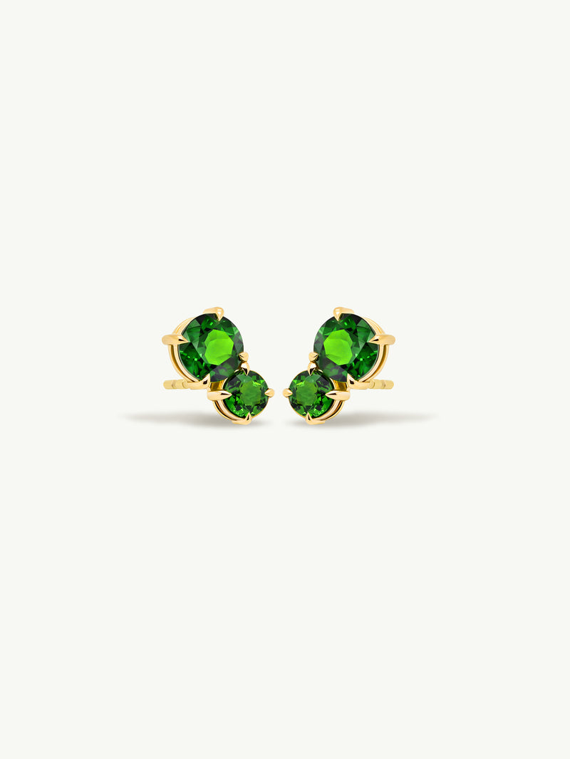 The Isadora Two-Stone Stud Earrings by Angie Marei feature gorgeous brilliant-cut green Tsavorite garnets and Tourmaline in luxurious 18-karat yellow gold claw settings. These earrings are named after the ancient Egyptian goddess Isis, who was known for her strength, beauty, and wisdom.