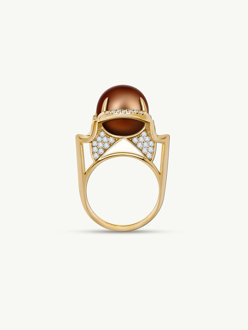 The Isis Goddess Pearl Ring by Angie Marei features a rare, exotic, and luminescent Japanese Akoya Chocolate Brown Pearl enthroned in an 18-karat yellow gold setting bejeweled in pavé set brilliant white diamonds. Detailed and finished with ivory-colored enamel.