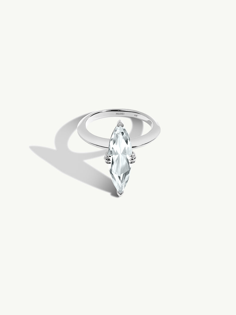 The Marei Aquamarine Engagement Ring by jewelry designer Angie Marei, showcases a stunning brilliant-cut Marquise White Aquamarine jewel enthroned in an Art-Deco-inspired claw setting. Handcrafted in platinum.