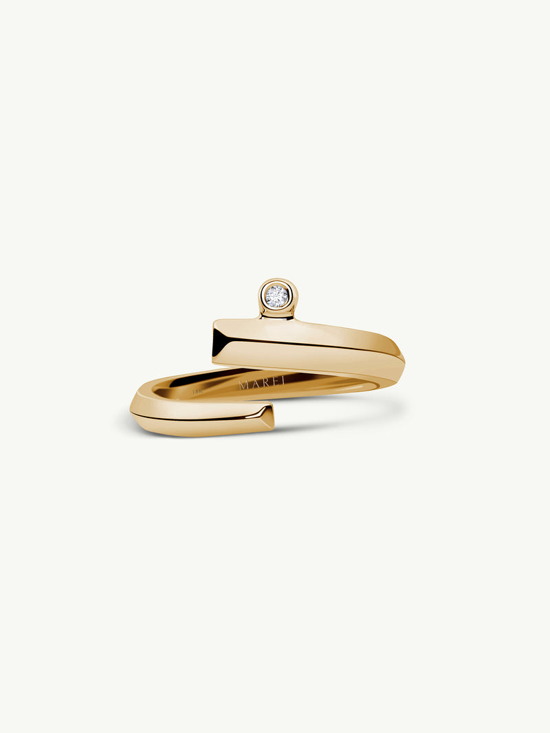 The Pythia Serpentine Coil Ring by Angie Marei features a beautiful sparkling brilliant-cut round white diamond set on a knife-edged ring handcrafted in solid 18-karat yellow gold. Inspired by Ancient Egyptian serpent jewelry, this contemporary design resembles a coiled serpent – the ancient symbol of royalty, divine authority, rebirth, immortality, and transformation – that seductively wraps around the finger. A fusion of sculpture and jewelry that delicately captures the essence of femininity and whispers erotic.